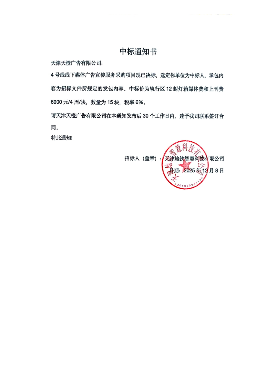 4号线下广告宣传服务采购项目中标通知书