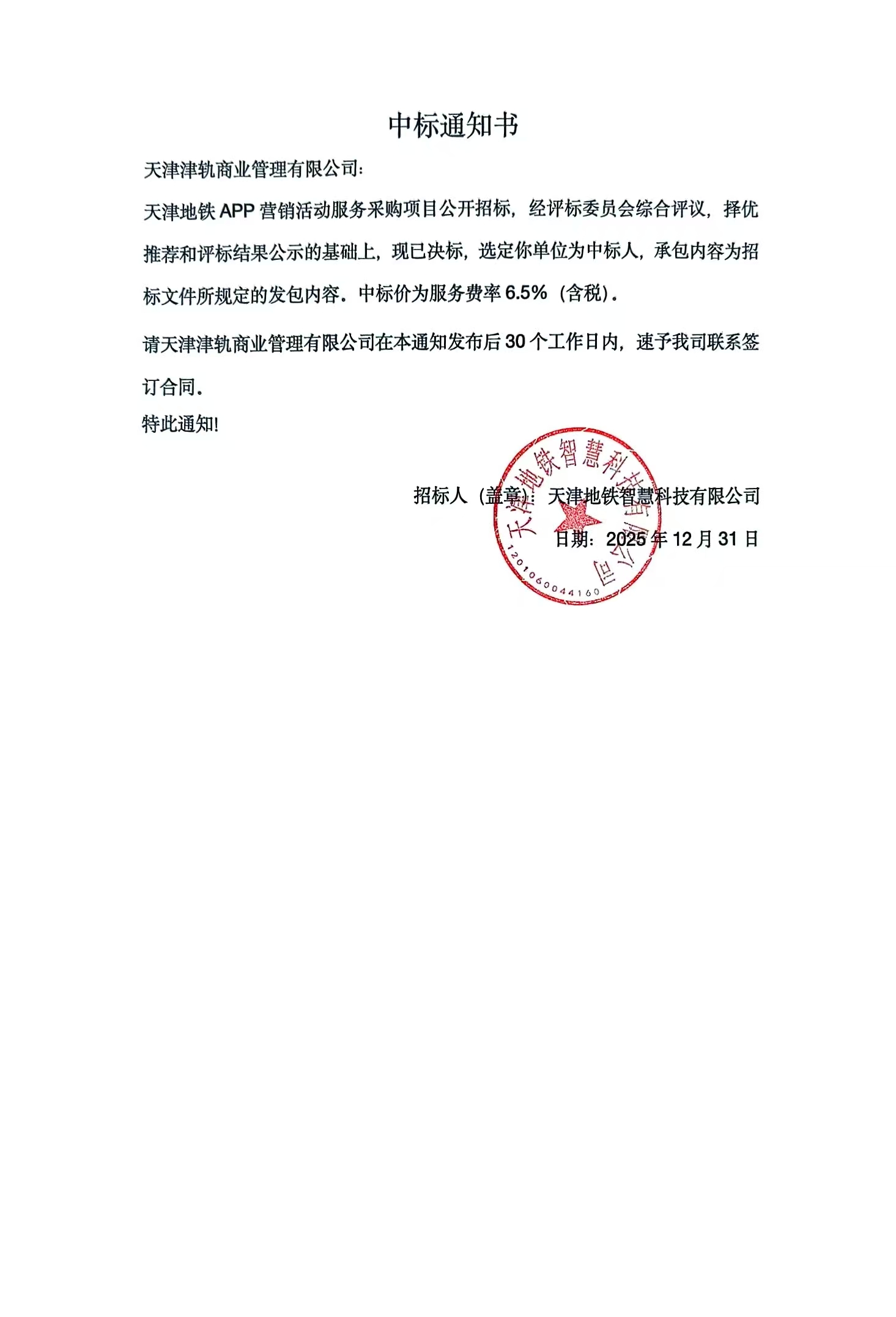 天津地铁APP营销活动服务采购项目中标通知书